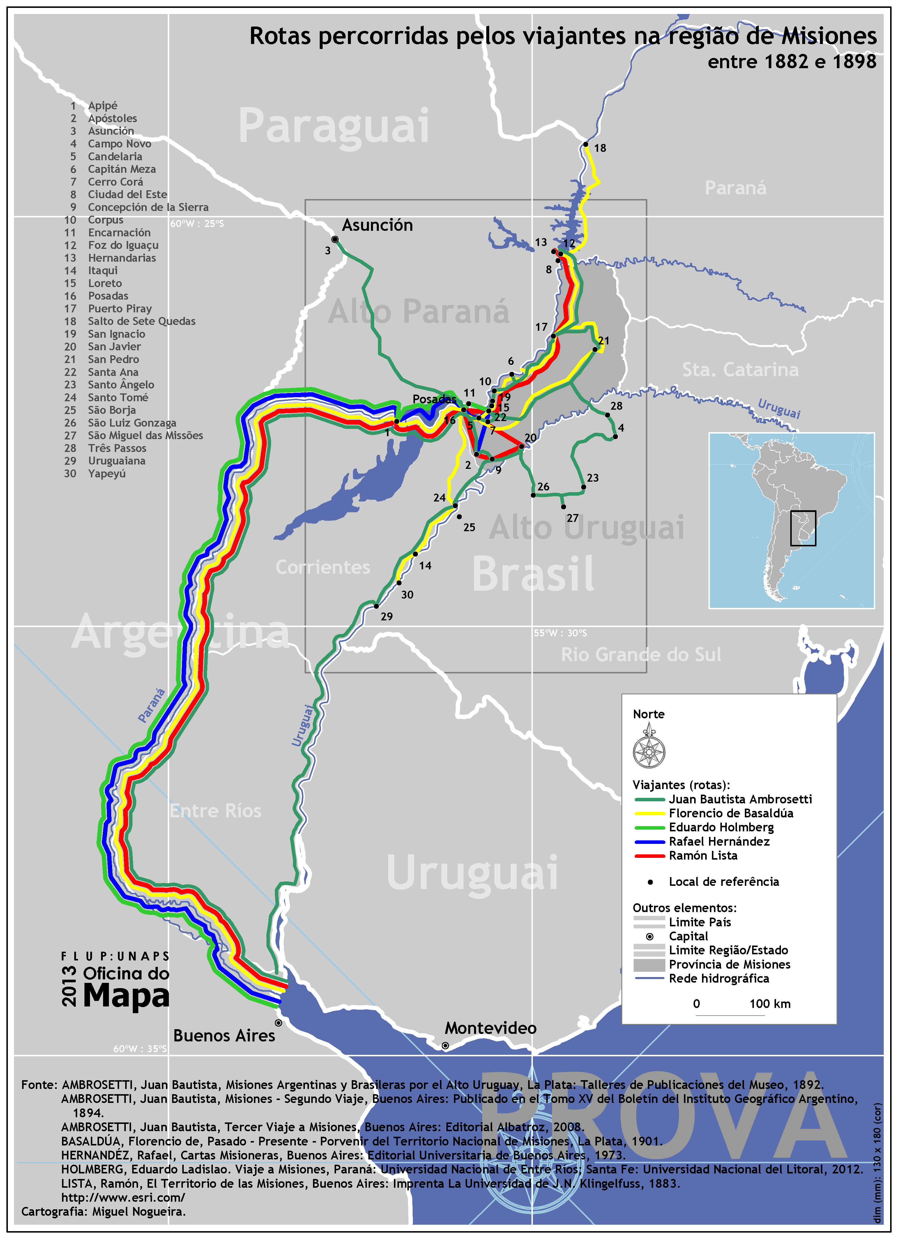 - Rotas percorridas pelos viajantes na região de Misiones entre 1882 e 1898. As localidades correspondem aos seus topônimos atuais. O Apipé refere-se a um salto atualmente submerso que existia durante o período das expedições.